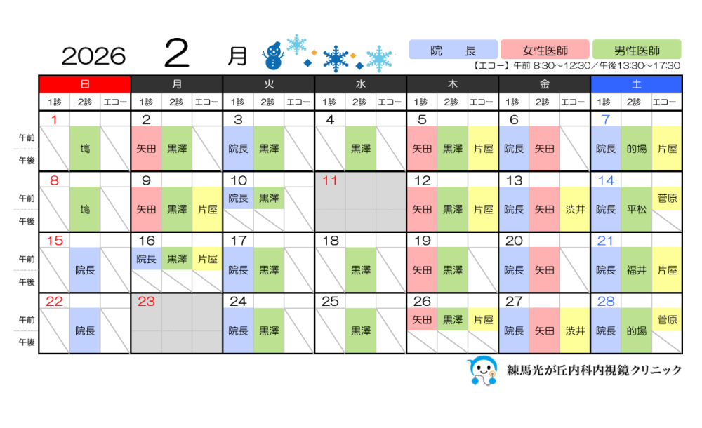 2026年2月の医師の勤務日および、エコー実施日は以下の通りです。