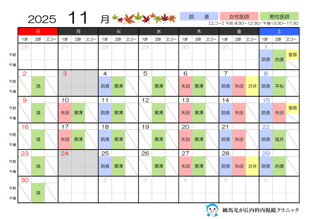 2025年11月の医師の勤務日および、エコー実施日は以下の通りです。