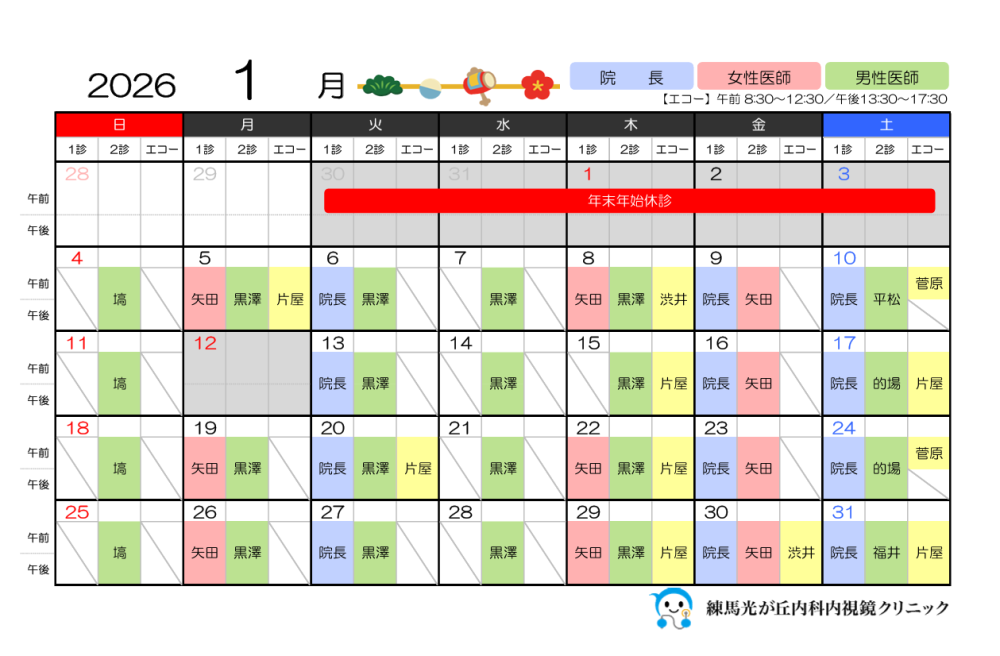 2026年1月の医師の勤務日および、エコー実施日は以下の通りです。