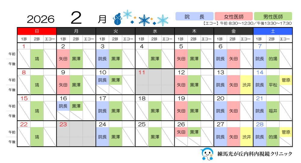 2026年2月の医師の勤務日および、エコー実施日は以下の通りです。