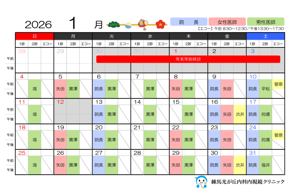 2026年1月の医師の勤務日および、エコー実施日は以下の通りです。 当院では、複数の医師が診察及び内視鏡検査を担当し、専門性の高い医師陣による高精度な内視鏡検査を実施しております。